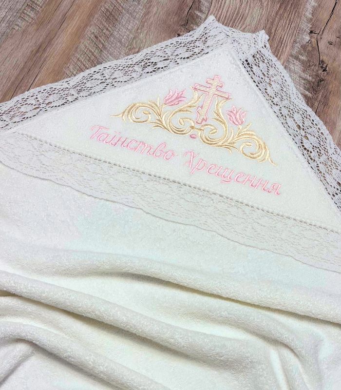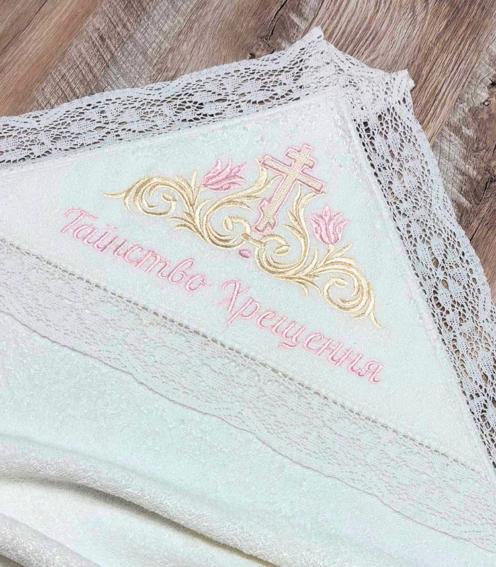 Дизайн доповнений витонченою вишивкою з хрестом і рослинними орнаментами у ніжній пастельній гамі. Квіткові елементи підкреслюють чистоту, ніжність і символіку хрещення, створюючи гармонійний та святковий образ. Крижма оздоблена вишуканим мереживом зі 100% натуральної бавовни, яке підкреслює витонченість і охайність виробу.