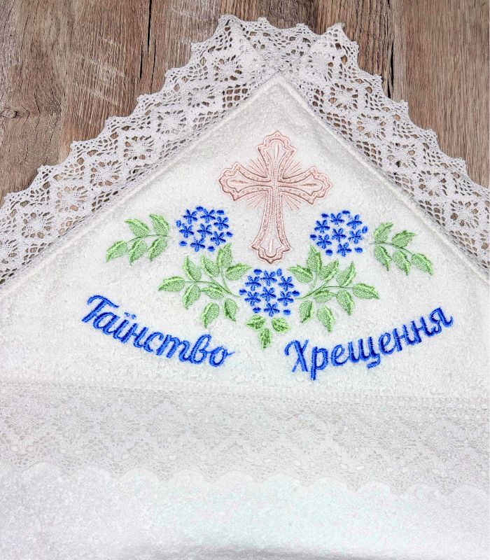Вишивка: хрест, доповнений квітковим візерунком і написом: “Таїнство Хрещення”