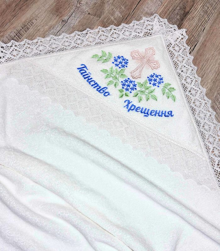 Тепла крижма «Світла мить» створена для особливого дня хрещення хлопчика. Вона виконана з натуральної турецької махрової тканини, м’якої, приємної до тіла та добре зігріваючої немовля після купелі. Край крижми оздоблений натуральним бавовняним мереживом, яке додає виробу ніжності та традиційного вигляду.